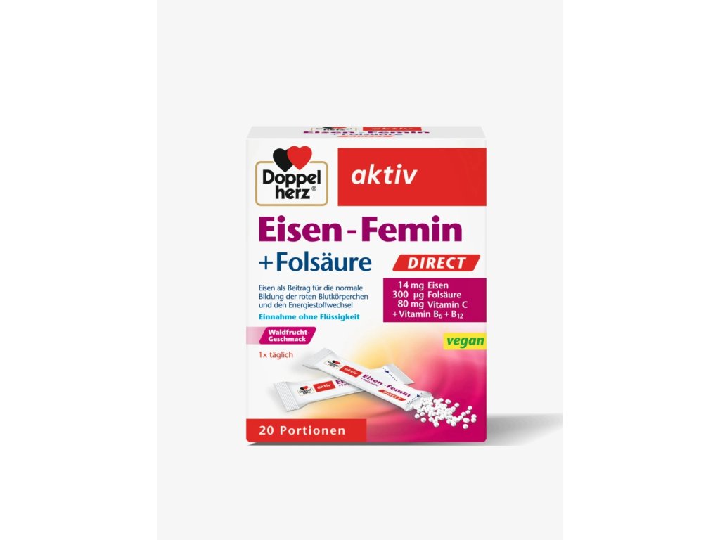 Doppelherz aktiv Eisen Femin Direct je vysoce efektivní doplněk stravy určený k podpoře tvorby červených krvinek a snížení únavy a vyčerpání. Obsahuje železo, které je nezbytné pro správnou funkci krvetvorby a transport kyslíku v těle. Vitamín C přispívá k lepšímu vstřebávání železa, čímž zvyšuje jeho účinnost. Vitamíny B6 a B12 jsou důležité pro normální funkci nervového systému a energetický metabolismus. Kyselina listová podporuje krvetvorbu a je zvláště důležitá pro ženy v reprodukčním věku, těhotné a kojící ženy. Praktické balení ve formě sáčků s přímou aplikací umožňuje jednoduché a pohodlné užívání, ideální pro ženy při menstruaci.