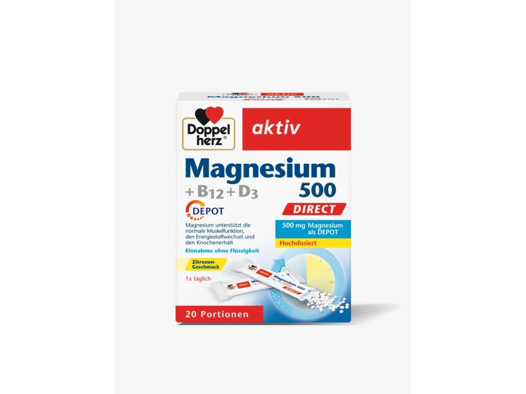 Doppelherz aktiv Magnesium 500 + B12 + D3 DIRECT DEPOT pomáhá při svalových křečích, nervovém napětí a únavě. Podporuje energetický metabolismus a přispívá k udržení zdravých kostí a svalů. Je ideální pro osoby se zvýšenou potřebou hořčíku, jako jsou sportovci nebo lidé vystavení stresu.